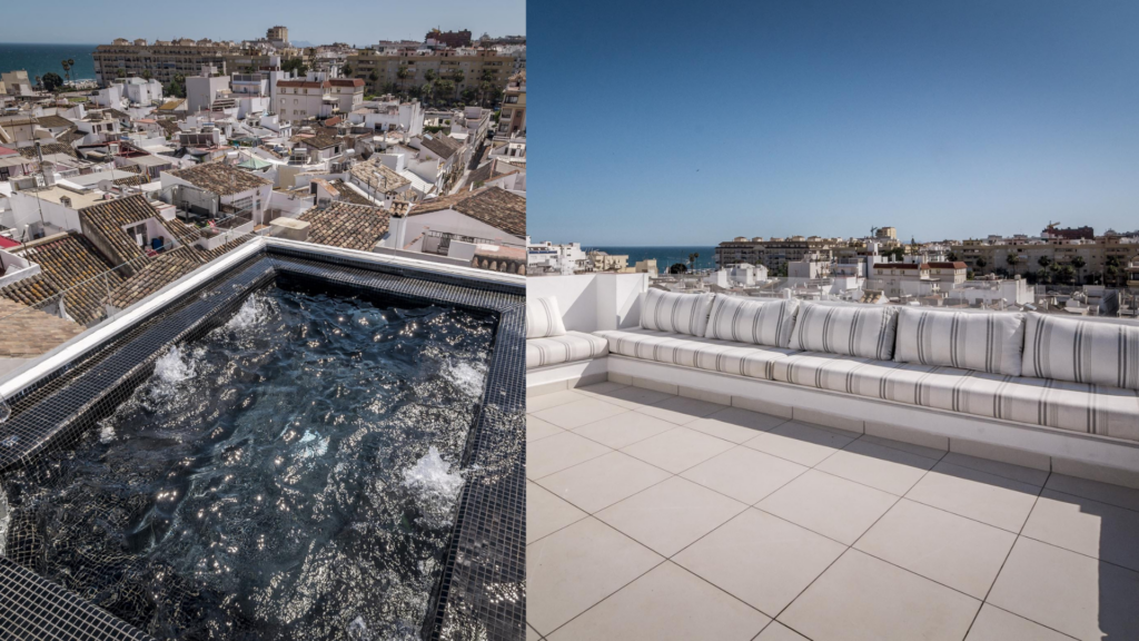 Le véritable joyau de l’établissement est sa terrasse spectaculaire sur le toit de 80 m². Cet espace exclusif comprend un coin salon élégant ainsi qu’une petite piscine intime, offrant de superbes vues sur la mer et les montagnes. Un cadre privilégié pour se détendre, savourer un verre au coucher du soleil et profiter pleinement du climat exceptionnel d’Estepona. (Pour les amateurs, l’hôte vous propose une carte de vins français et espagnol de grande qualité.)